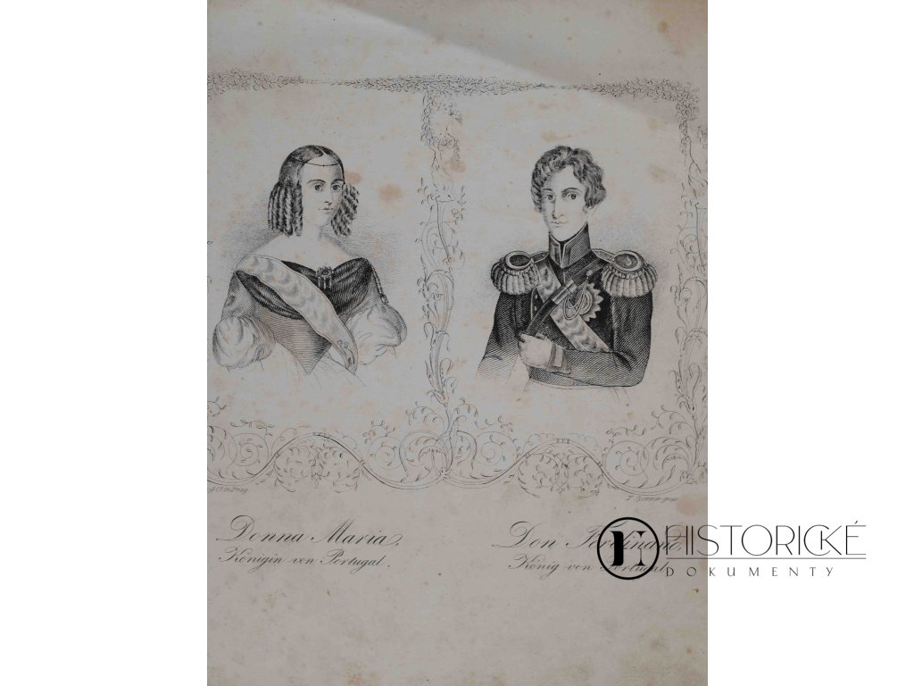Grafika historická, ocelorytina jemná z knihy staré, zobrazující dvojportrét královský portugalský – Její Veličenstvo Dona Maria II. Luisa a Jeho Veličenstvo Don Ferdinand, choť její z rodu Sasko-Coburg-Gothajského. Královna Maria vládla Portugalsku v letech třicátých a čtyřicátých století devatenáctého, princ Ferdinand pak jakožto král-manžel po boku jejím stál. Rytina provedena jest technikou oceloryteckou, jež jemnosti čar neobyčejné dosahuje, an tváře královské i šaty nádherné s precizností věrnou zachycuje. Doba romantismu milovala portréty panovníků a šlechty evropské. Vzácný list pro sběratele grafiky a ctitele monarchií pyrenejských