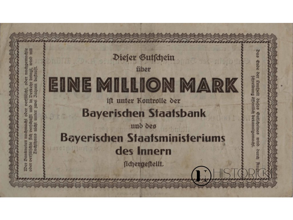 Nouzový peníz v hodnotě jednoho milionu marek, číslo 71648, vydaný 24. srpna 1923 Bavorskou státní bankou (Bayerische Staatsbank) v Mnichově. Tento autentický notgeld pochází z vrcholu německé hyperinflace roku 1923, kdy se hodnota marky dramaticky zhroutila. Bankovka představuje vzácný numismatický dokument z období Výmarské republiky, jenž svědčí o katastrofálních hospodářských poměrech poválečného Bavorska. Jedná se o výtečnou památku pro sběratele inflačních bankovek a badatele monetární historie německých zemí dvacátých let.