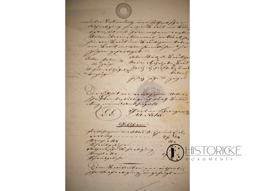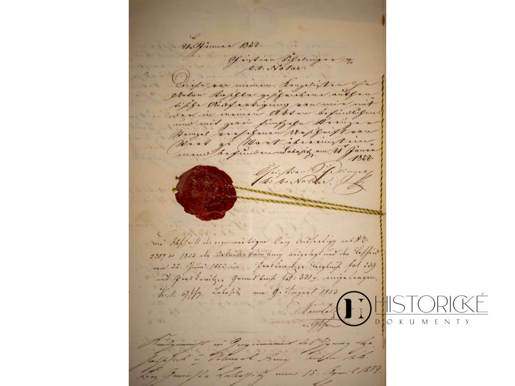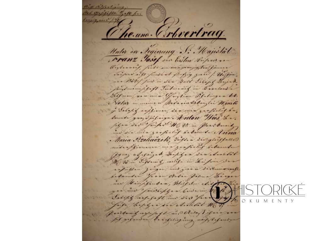 Velevzácný historický dokument, Ehe-und-Erbvertrag (Svatební a dědická smlouva) z dob slavné vlády Jeho Veličenstva císaře Františka Josefa I. Listina jest vyhotovena překrásným krasopisným písmem, jakož tehdy ve zvyku bylo, s početnou paginací a kolkovým razítkem v hodnotě 50 krejcarů. Sepsána bezpochyby c.k. notářem, jenž sňatek mezi panem Antonem Weissem a jeho vyvolenou Annou Marií Rycháčzekovou úředně potvrzuje. Dokument jedinečné historické hodnoty, v dokonale zachovalém stavu.