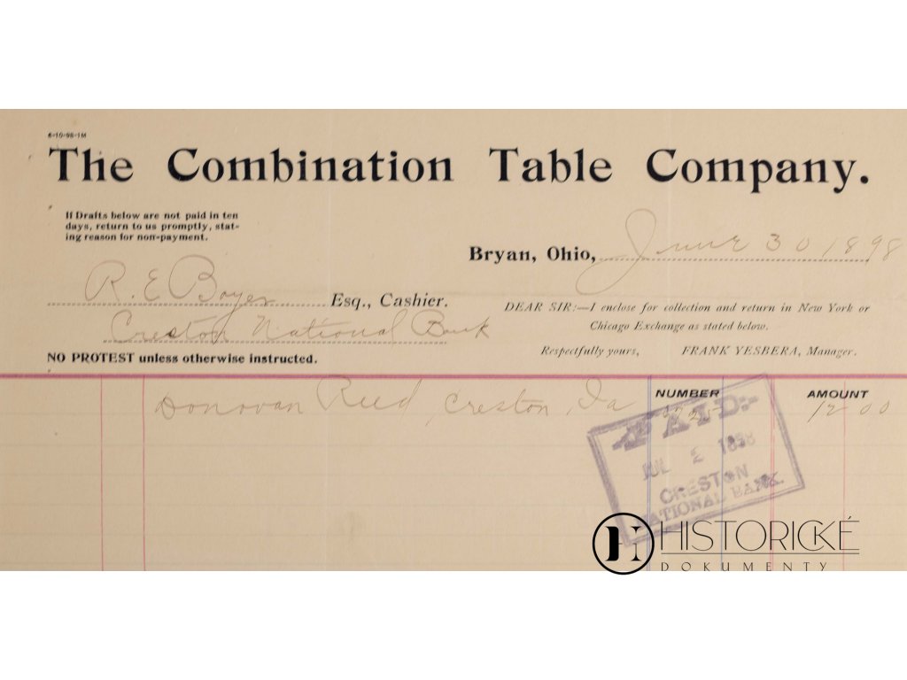Dokument obsahuje žádost o inkaso směnky na Donner Reed v Crestonu, Iowa, v hodnotě 7200 dolarů, což představuje značnou částku pro tehdejší dobu. Formulář podepsán jest manažerem Frankem Yesberou s poznámkou "NO PROTEST unless otherwise instructed". Opatřen jest fialovým razítkem s datem z června 1891. Pro sběratele amerických obchodních memorabilií předmět nadmíru zajímavý, jenž dokládá obchodní vztahy mezi různými státy na americkém středozápadě.