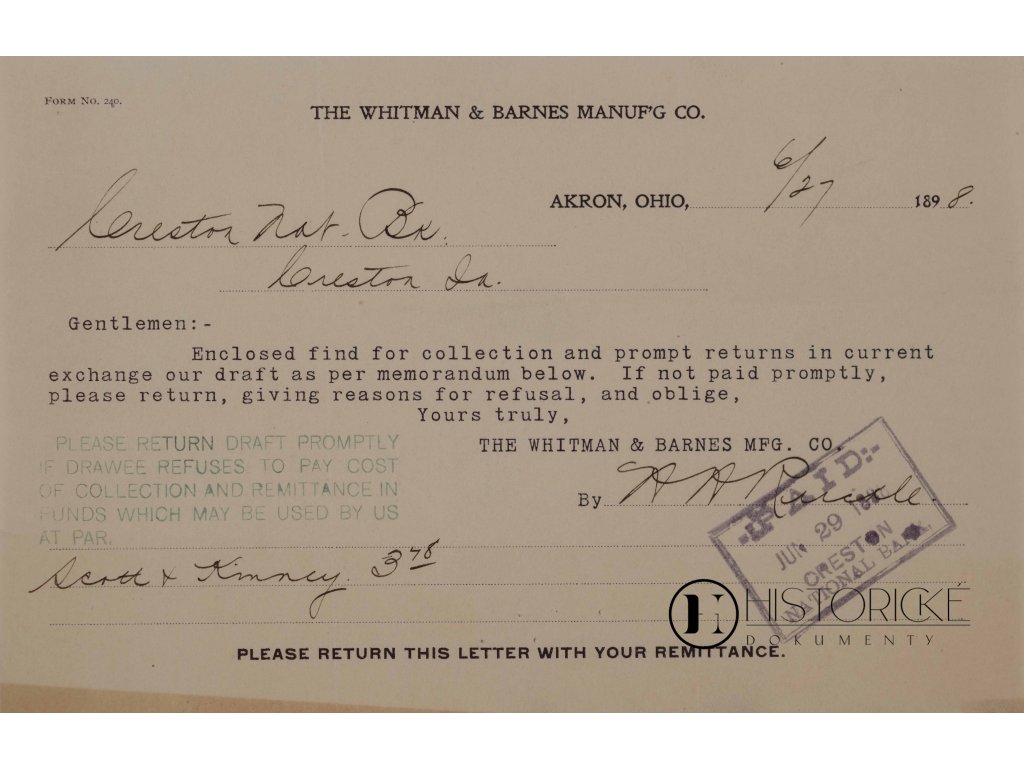 Dopis jest adresován Creston National Bank v Crestonu, Iowa, a obsahuje žádost o inkaso a okamžité vrácení směnky na Scott & Kinney v hodnotě 578 dolarů podle přiloženého memoranda. Dokument jest opatřen bankovním razítkem z 29. června. Jedná se o autentický historický pramen amerického průmyslového a bankovního života konce 19. století. Neocenitelný materiál pro badatele ekonomických dějin USA a obchodních praktik té doby.