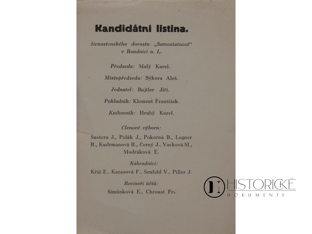 Historická kandidátní listina živnostenského souboru "Samostatnost" v Roudnici nad Labem. Jedná se o autentický dokument z oblasti československé politiky a živnostenského hnutí z meziválečného období, jenž svědčí o politické organizaci řemeslníků a živnostníků ve středních Čechách. Živnostenský soubor Samostatnost reprezentoval zájmy drobných podnikatelů a řemeslníků v místních volbách. Roudnice nad Labem jako okresní město měla aktivní politický život s různými zájmovými skupinami. Neocenitelný materiál pro badatele dějin československé politiky a regionálního politického života. Zajímavá památka politické organizace živnostníků první republiky.