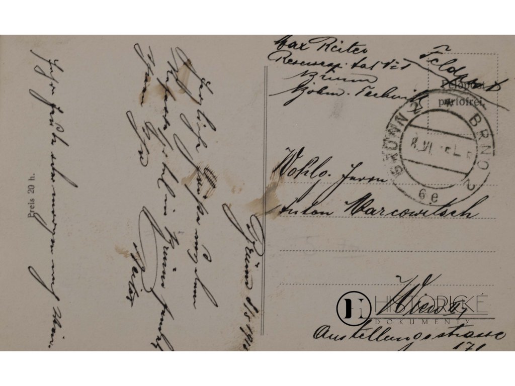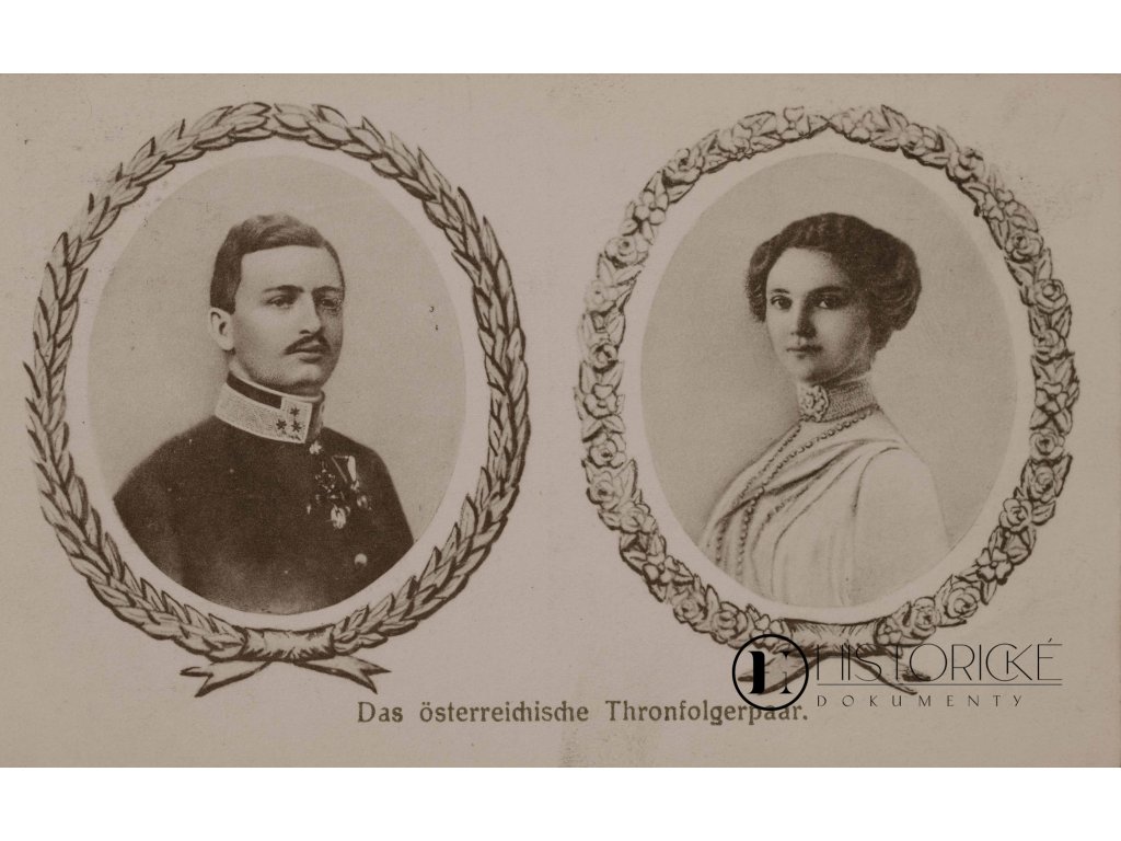 Podobizny zasazeny v ozdobných medailonech s vavřínovým a růžovým věncem, s nápisem Das österreichische Thronfolgerpaar. Pohlednice zaslaná polní poštou z Brna, adresovaná uroz. panu Antonu Marcowitsch do Vídně na Ausstellungsstrasse. Text psán v jazyce německém. Cena pohlednice 20 haléřů. Vzácný doklad doby válečné a posledního panovnického páru na trůně habsburském.