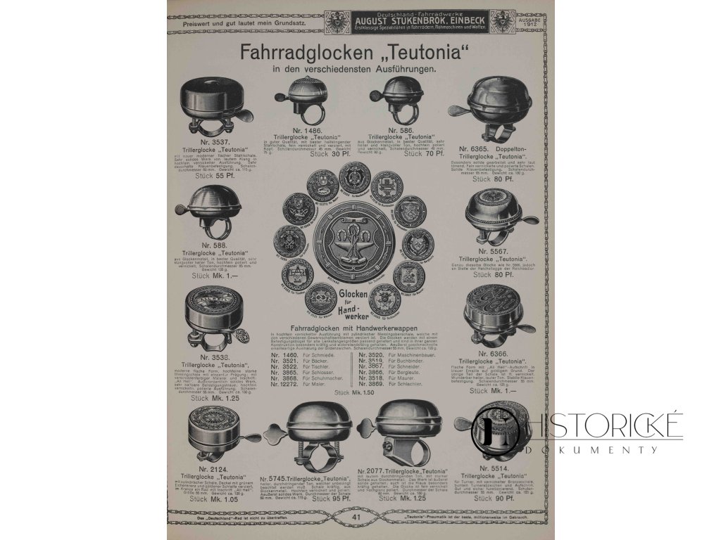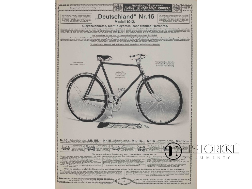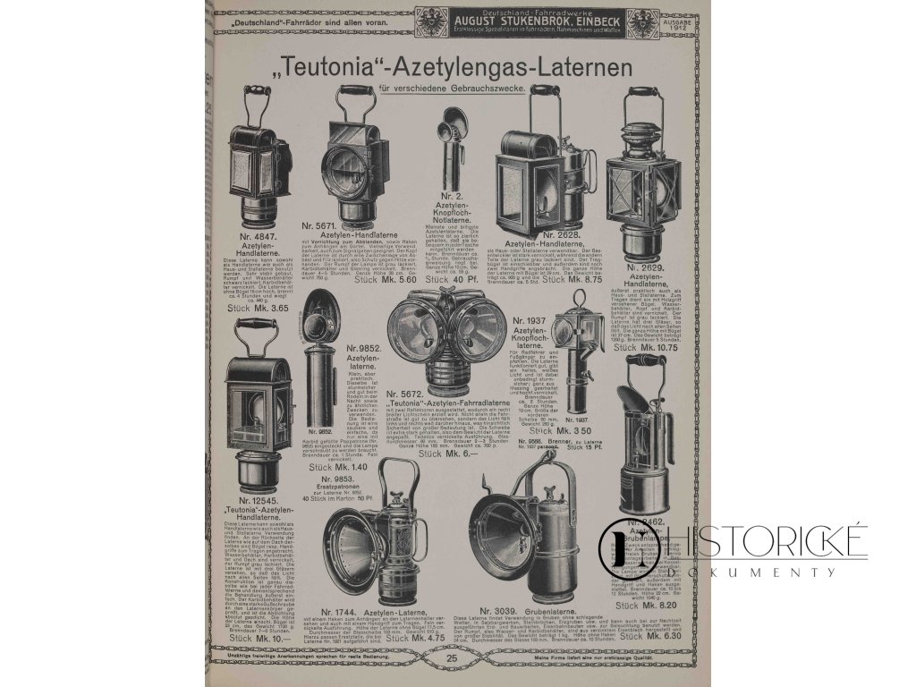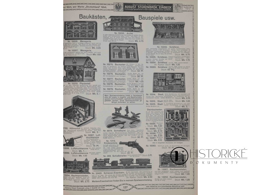 Krásně vypravený ilustrovaný katalog firmy August Stukenbrok z Einbecku, původně vydaný roku 1912. Reprint nakladatelství Olms Presse z roku 1996 přináší fascinující pohled do světa sportovního a spotřebního zboží vilémovského Německa. Katalog o 238 stranách nabízí velký sortiment bicyklů, motocyklů, šicích strojů, gramofonů, fotografických přístrojů, sportovních potřeb i domácího vybavení, vše s detailními ilustracemi a cenami. Firma Stukenbrok patřila k průkopníkům zásilkového obchodu v Německu, její katalogy oslovovaly zákazníky po celé říši. Reprint zachovává původní typografii, ilustrace i reklamy, jež dokumentují životní styl a konzumní kulturu počátku dvacátého století. Zachovalost výtečná. Ideální pro sběratele a historiky designu.