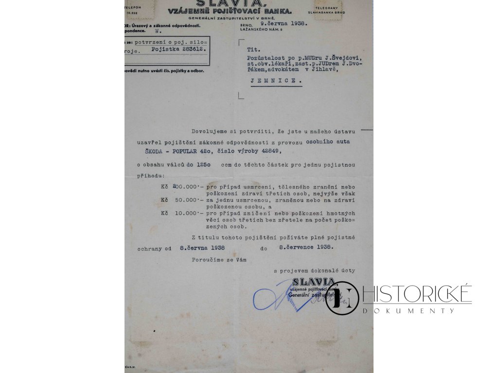 Obchodní korespondence Pojišťovny Slavia z osmého dne měsíce června léta Páně 1938, obsahující potvrzení o uzavření pojištění zákonné odpovědnosti z provozu osobního automobilu značky Škoda - Popular 420. Tento historický dokument pochází z posledního roku První republiky, krátce před Mnichovskou zradou a okupací. Pojišťovna Slavia byla jednou z předních pojišťoven meziválečného Československa. Automobil Škoda Popular 420 představoval moderní vůz tehdejší doby, jenž si oblíbilo mnoho majitelů automobilů. Listina vytištěna jest na hlavičkovém papíře pojišťovny s razítky a podpisy úředními. Pro sběratele dokumentů automobilové historie a pojišťovnictví představuje tato rarita jedinečné svědectví o každodenním životě a obchodu v předválečném Československu.