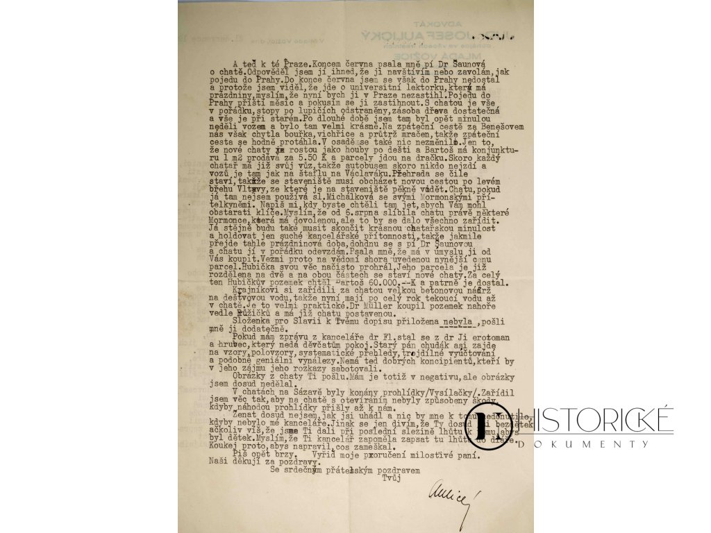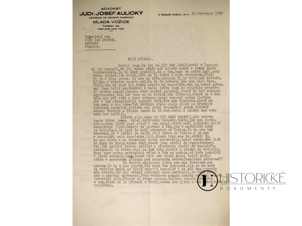 Obchodní korespondence týkající se škodné události na nemovitosti a pojištění u Banky Slavia, datovaná k 21. červenci léta Páně 1939. Dokument adresován jest JUDr. Janu Dvořákovi od JUDr. Josefa Aulického. Jedná se o strojopis psaný v přátelské atmosféře, což svědčí o osobním známství obou právníků. Korespondence pochází z posledního roku míru před vypuknutím druhé světové války a ilustruje běžný právní styk v oblasti pojišťovnictví. Pro sběratele právnických memorabilií i badatele v dějinách pojišťovnictví a advokátního stavu předmět nadmíru zajímavý, jenž dokládá profesionální praxi advokátů v oblasti pojišťovacího práva v posledním předválečném roce.