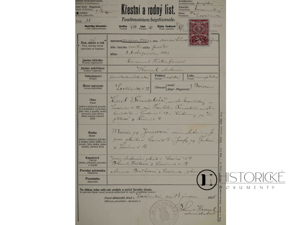 Křestní a rodný list z farnosti Loděnice, vydaný dne 3. listopadu léta Páně 1901, za panování císaře a krále Františka Josefa I. Dokument náleží k arcidiecézi Pražské, vikariátu II. berounskému a faře loděnické. Listina krasopisně vypravena jest rukou faráře zběhlou, opatřena razítkem farním i kolkem v hodnotě pěti korun. Křestní listy církevní sloužily jakožto doklady totožnosti, neboť matriky farní vedly záznamy o narozeních, sňatcích i úmrtích všeho obyvatelstva. Loděnice, obec starobylá v kraji podbrdském nedaleko Berouna, farnost svou od věků měla. Vzácná památka rodopisná pro genealogy i sběratele církevních dokumentů.