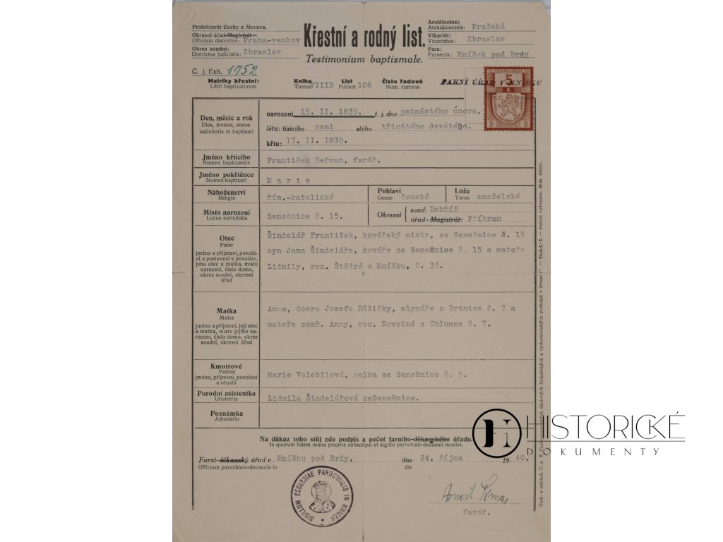 Křestní a rodný list z farnosti Mníšek pod Brdy, vydaný dne 24. září léta 1940, v dobách Protektorátu Čechy a Morava. Dokument náleží k arcidiecézi Pražské a vikariátu zbraslavskému, farností pak jest Mníšek pod Brdy, městečko starobylé v podhůří brdském. Listina vypravena jest strojopisem, opatřena razítkem farním i kolkem v hodnotě pěti korun protektorátních. Křestní listy církevní sloužily jakožto doklady totožnosti, neboť matriky farní vedly záznamy o narozeních, sňatcích i úmrtích všeho obyvatelstva. I v dobách okupace církev úřad svůj svědomitě konala. Vzácná památka rodopisná pro genealogy i sběratele dokumentů farních.