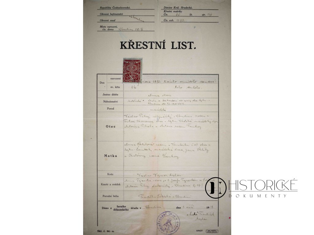 To úřední dokument jest, křestní list z města Chrudimě, vydaný prvního dne měsíce září léta Páně 1919. Opatřen jest kolkem v hodnotě 2 korun československých a úředním razítkem, jakož zákon předpisoval. Dokument tento náleží pod správu Diecése Královéhradecké, již té doby pod ochranou mladičké Republiky Československé stála. Na listu vidno jest razítko farního úřadu, stvrzující jeho pravost. Tento křestní list vzácným jest dokladem církevní správy v prvých letech samostatného státu našeho a cenným artefaktem pro milovníky dějin církevních i státních.