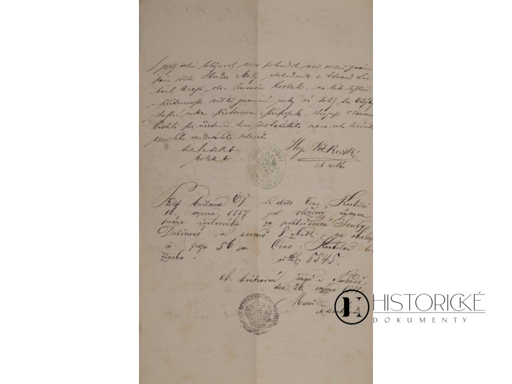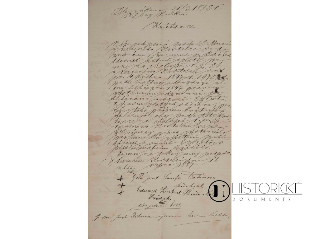 Níže podepsaná Josefa Drtinová z Červeného Kostelce potvrzuje, že pan Bedřich Adámek hotově zaplatil obnos osmi zlatých za právo zástavní pohledávání na chalupě číslo popisné 36 v Červeném Kostelci, dle listiny darovací ze dne 20. března 1847. Dokument psán jest rukou krasopisnou, podepsán značkou kříže za Josefu Drtinovou, jež psáti neuměla, a stvrzeno svědky Eduardem Linhartem a Theodorem Malým. Číslo knihovní 4145. Vzácná památka právních poměrů venkovských za mocnářství Rakousko-Uherského.