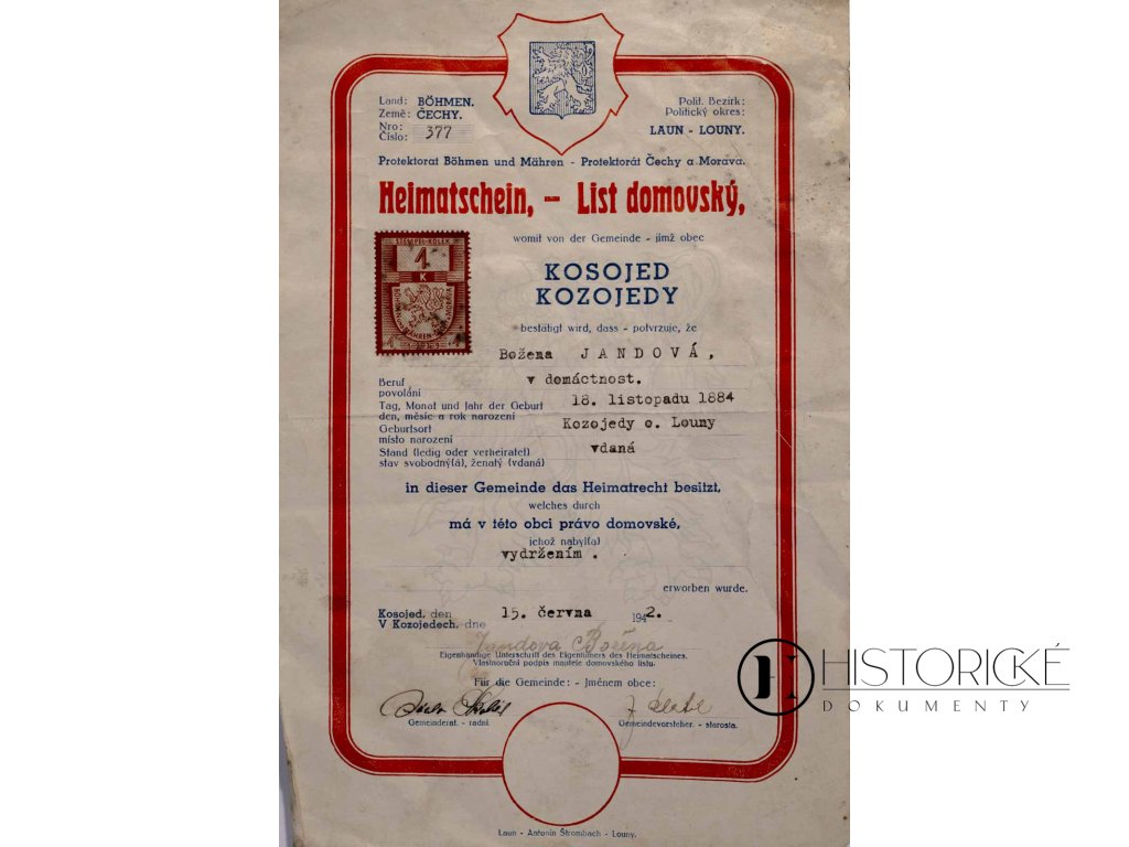 Domovský list (Heimatschein) byl klíčovým úředním dokumentem ve střední Evropě od 19. století do poloviny 20. století. Potvrzoval příslušnost jedince k určité obci, což mělo zásadní význam pro sociální a právní status. V kontextu roku 1942, během druhé světové války a německé okupace, nabýval domovský list nového významu v souvislosti s národnostní politikou a pohybem obyvatelstva. Tento dokument ilustruje komplexní vztahy mezi jednotlivcem, obcí a státem v turbulentním období evropských dějin.
