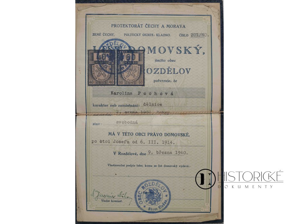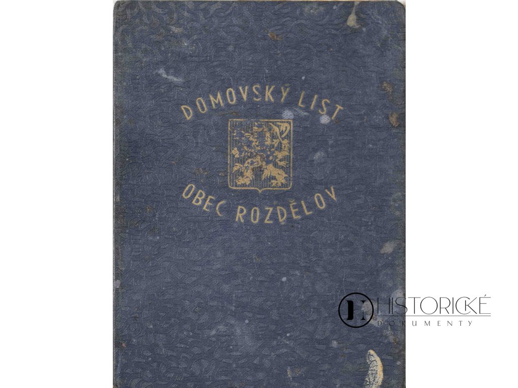 Historický domovský list z Rozdělova ze dne 6. března 1940, opatřený kolky v hodnotě 40 a 60 haléřů, razítkem a uložený v tvrdých deskách. K dokumentu jest přiloženo potvrzení o občanství. Jedná se o autentický pramen z počátku protektorátu, jenž svědčí o fungování české občanské administrativy v dramatických dnech po okupaci. Domovský list představoval důležitý dokument občanských práv a místní příslušnosti během německé okupace. Kombinace s potvrzením občanství dokládá složitost právních poměrů v protektorátu. Neocenitelný materiál pro badatele dějin protektorátu a genealogického bádání z válečného období.