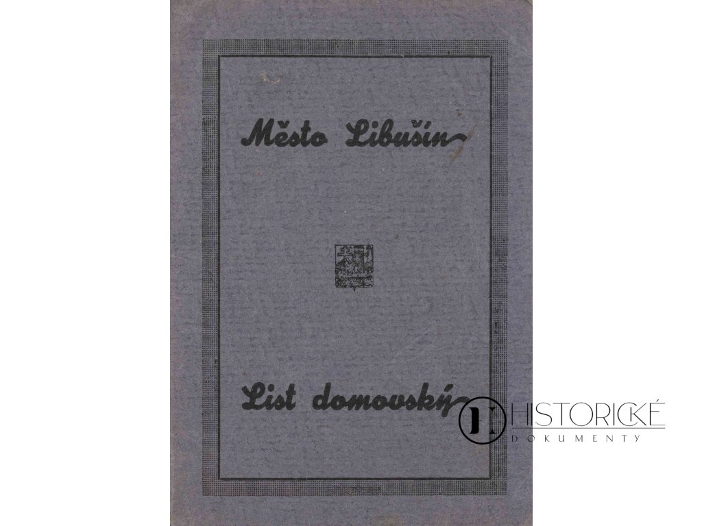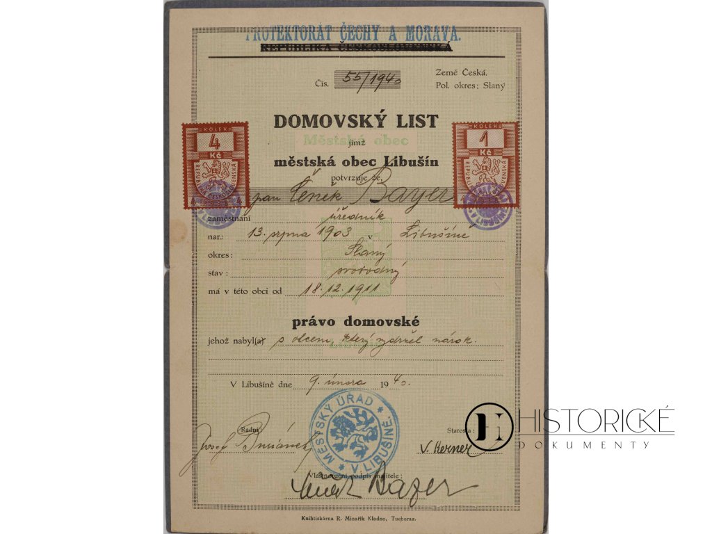Domovský list z Libušína z 9. února 1940, číslo 55/1940, opatřený kolky v hodnotě 2 x 4 Kč. Dokument jest opatřen razítkem Městského úřadu a podpisy úředníků. Jedná se o autentický historický pramen z období druhé republiky krátce po vzniku protektorátu, jenž svědčí o fungování české občanské administrativy v dramatických časech. Domovský list představuje důležitý dokument občanských práv a místní příslušnosti. Neocenitelný materiál pro badatele dějin protektorátu a genealogického bádání. Vzácná památka úřední administrativy válečného období.