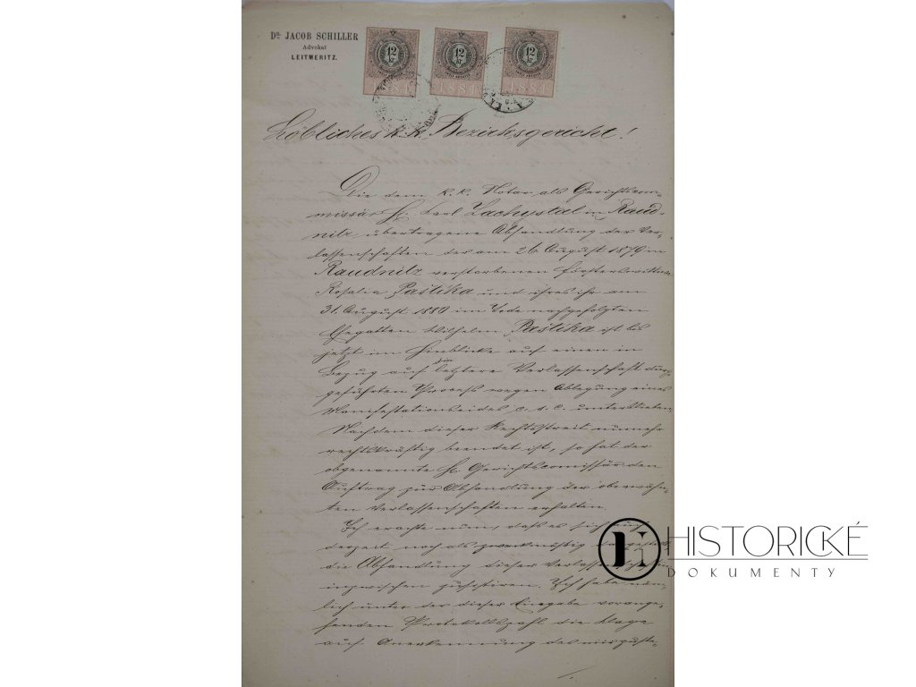 Dopis jest nadepsán německy kurzívou jako "Löbliches k.k. Bezirksgericht" (Chvályhodný c.k. okresní soud) a obsahuje právní korespondenci týkající se soudních záležitostí. Jedná se o autentický dokument z oblasti rakouské právní praxe 19. století, jenž svědčí o fungování advokátních kanceláří v monarchii. Neocenitelný materiál pro badatele rakouského práva a filatelisty. Zajímavá kombinace právního dokumentu a filatelistického materiálu z Habsburské monarchie.