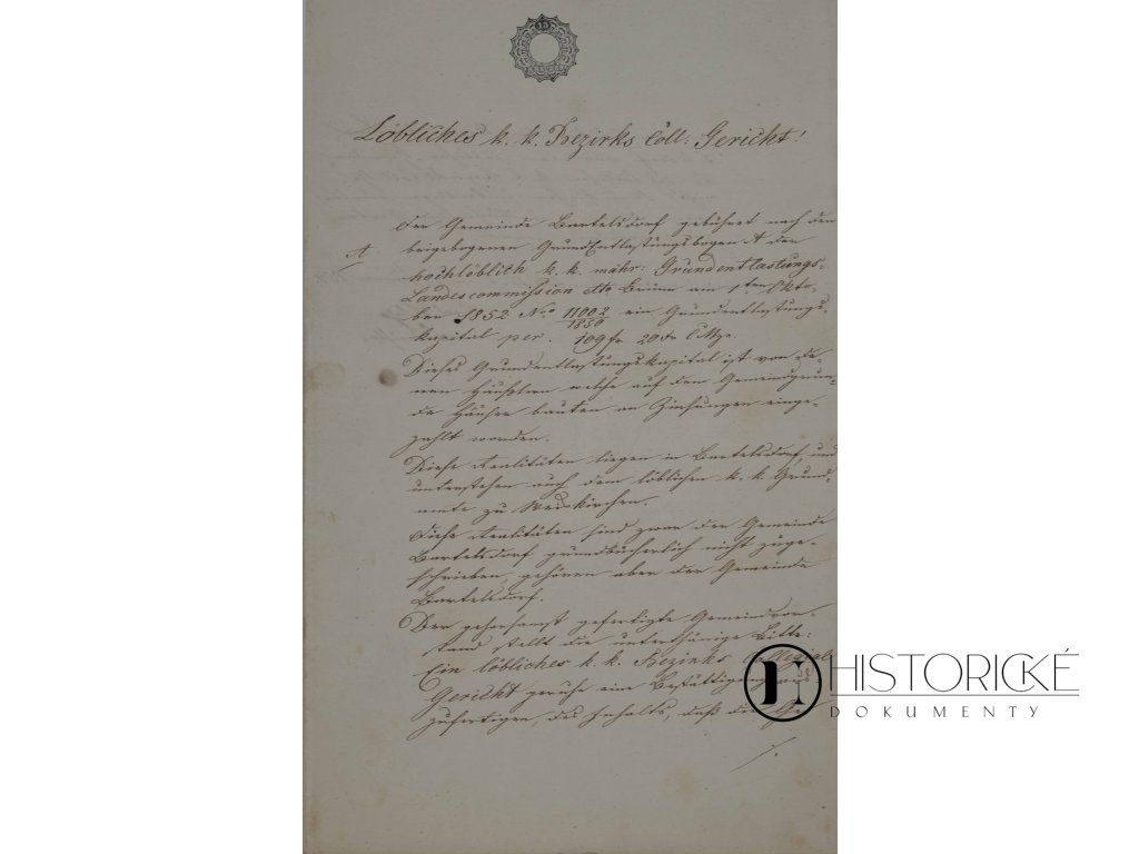 Listina pochází z obce Leutalsdorf a jest sepsána ve věci pozemkového odlehčení — Grundentlastung — dle grundentlastungslistu vydaného Vysoce chvalnou c. k. moravskou Zemskou komisí pro odlehčení pozemků ze dne 1. října 1852, č. 11002, s kapitálem 109 zlatých 20 krejcarů konvenční mince. Listina jest vzácným svědectvím o procesu zrušení feudálních povinností po revolučním roce 1848. Stav velmi dobrý.