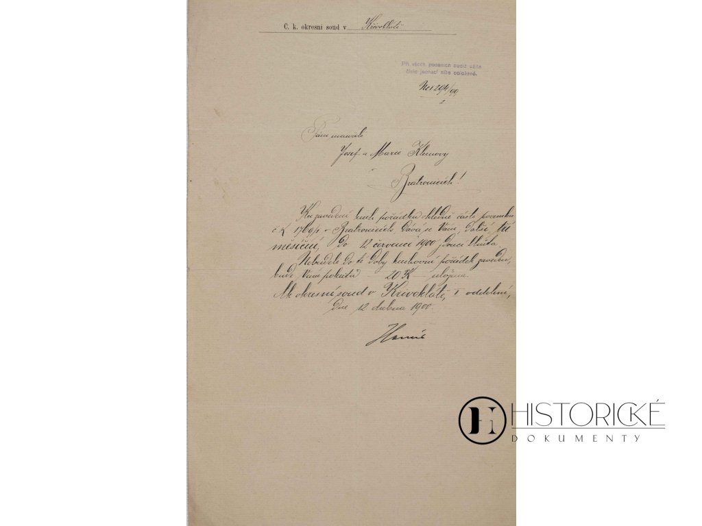Soudní listina c. k. okresního soudu v Křivoklátě ze dne 12. dubna roku 1900, obsahující výzvu k pořádku adresovanou účastníku řízení soudního. Dokument sepsán na hlavičkovém papíru úředním, text provedený rukou písařskou a opatřený razítkem soudu křivoklátského. Výzvy k pořádku náležely k prostředkům, jimiž soudcové kárali strany porušující slušnost či řád jednací. Křivoklát, město pod hradem královským obklopené lesy hlubokými, hostil okresní soud pro široké okolí. Listina dokládá fungování justice v posledních letech panování císaře Františka Josefa I., kdy soudy c. k. dbaly na dodržování zákonů přísně. Papír kvalitní, inkoust nezbledlý, razítko otištěno zřetelně.