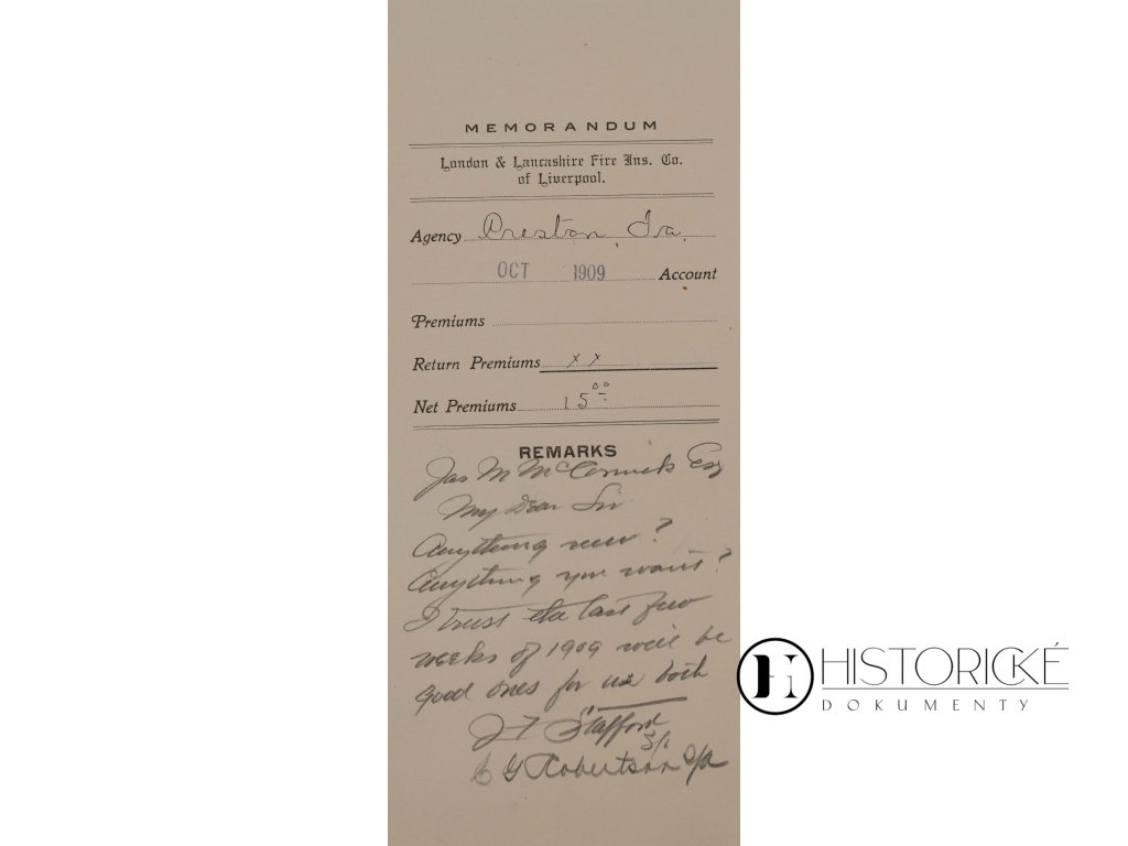 Dokument obsahuje účetní přehled s pojistnými a vratkami, čisté pojistné ve výši 5,19 dolaru a poznámky pod podpisem J. F. Stafford, ředitele divize. Jedná se o autentický historický pramen z oblasti amerického pojišťovnictví počátku 20. století. Dokument svědčí o činnosti britské pojišťovny na americkém trhu a obchodních vztazích mezi Evropou a USA. Neocenitelný materiál pro badatele pojišťovacích a obchodních dějin anglo-amerických vztahů.