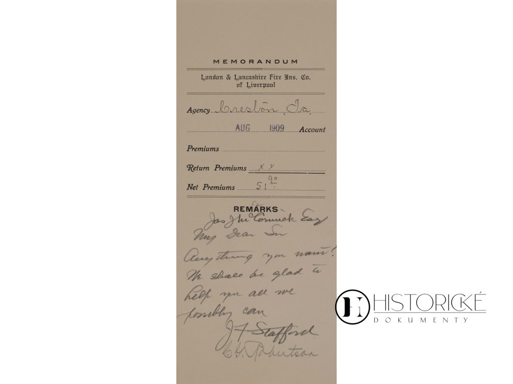 Dokument obsahuje účetní přehled s pojistnými a vratkami, čisté pojistné ve výši 5,19 dolaru a poznámky pod podpisem J. F. Stafford, ředitele divize. Jedná se o autentický historický pramen z oblasti amerického pojišťovnictví počátku 20. století. Dokument svědčí o činnosti britské pojišťovny na americkém trhu a obchodních vztazích mezi Evropou a USA. Neocenitelný materiál pro badatele pojišťovacích a obchodních dějin anglo-amerických vztahů.
