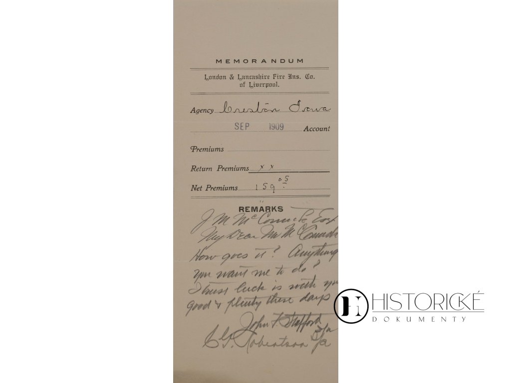 Dokument obsahuje účetní přehled s pojistnými a vratkami, čisté pojistné ve výši 5,19 dolaru a poznámky pod podpisem J. F. Stafford, ředitele divize. Jedná se o autentický historický pramen z oblasti amerického pojišťovnictví počátku 20. století. Dokument svědčí o činnosti britské pojišťovny na americkém trhu a obchodních vztazích mezi Evropou a USA. Neocenitelný materiál pro badatele pojišťovacích a obchodních dějin anglo-amerických vztahů.