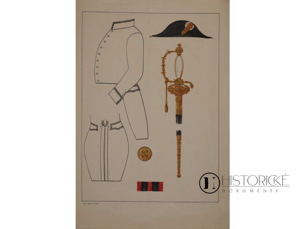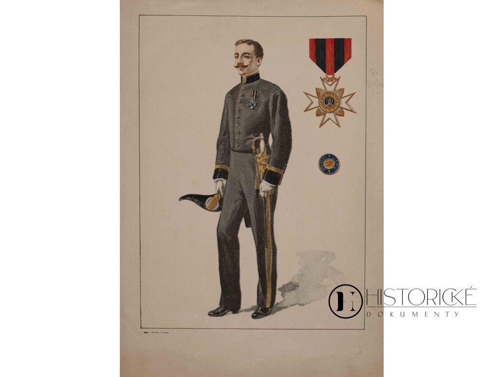 První list zobrazuje celou postavu důstojníka v šedém mundúru se zlatými výložkami, šavlí a bicornem, doplněnou detailním vyobrazením řádového kříže na červenočerné stuze a modrého medailónu. Druhý list přináší technický návrh střihu kabátce, detaily výzbroje — nádherně zdobenou zlatou jílec šavle s pochvou — a stuhu s knoflíkem. Tisky jsou vzácnými doklady vojenské uniformistiky a faleristiky přelomu devatenáctého a dvacátého věku. Stav obou listů velmi pěkný.
