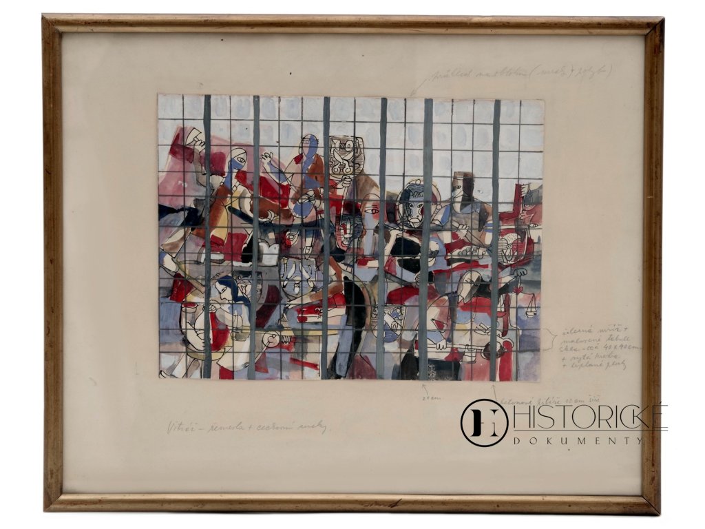 Návrh zhotoven pro brasserii hotelu Intercontinental v Praze roku 1972. Josef Jíra, rodák z Turnova žijící v letech 1929 až 2005, patřil k významným českým malířům a ilustrátorům, spojený s krajinou Českého ráje a Malé Skály. Jeho dílo zahrnuje monumentální realizace, knižní ilustrace i volnou tvorbu. Rozměry 30 x 22 cm, rámováno a zaskleno. Součástí jest i návrh na technické řešení vitráže. Dílo pochází z pozůstalosti ing. Karla Vavřínka. Hotel Intercontinental, otevřený roku 1974, representoval vrchol socialistické hotelové architektury. Unikátní sběratelský kus.