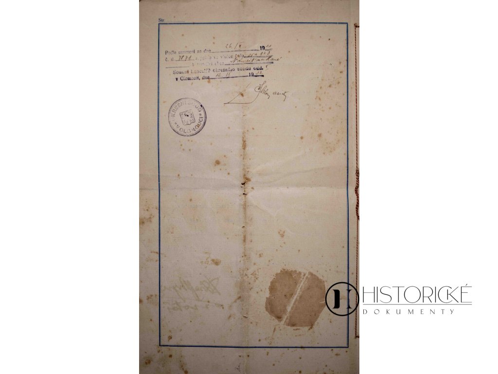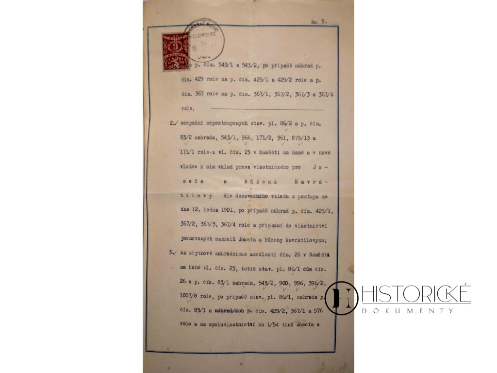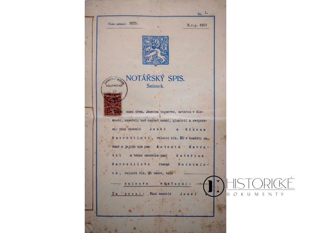 Snímek notářského spisu číslo 9325 z léta Páně 1932, notářem v Olomouci vyhotovený, kolky v hodnotě třikráte tří korun a razítky opatřený. Jest to dokument o dvanácti listech svázaných, smlouvu odstupující obsahující. Artefakt tento poskytuje vzácné svědectví o právní praxi první republiky a jest dokladem velezdařilým činnosti notářské.