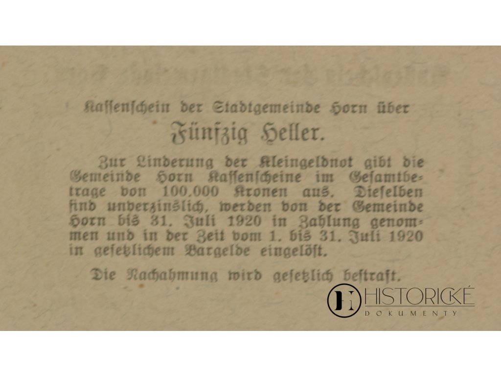 Jedná se o typický komunální gutschein vydaný během poválečné hospodářské krize po rozpadu monarchie. Bankovka jest podepsána vicestrostou F. Maudnerem, starostou A. Wizlspergerem a obecním radou R. Haagenem s platností do 31. července 1920. Text uvádí vydání v celkové výši 100 000 korun k zmírnění nedostatku drobných peněz. Představuje klasický příklad rakouského místního platidla z let 1918-1922, kdy obce vydávaly vlastní bankovky pro řešení měnové krize. Numismaticky významný dokument poválečné rakouské ekonomiky.