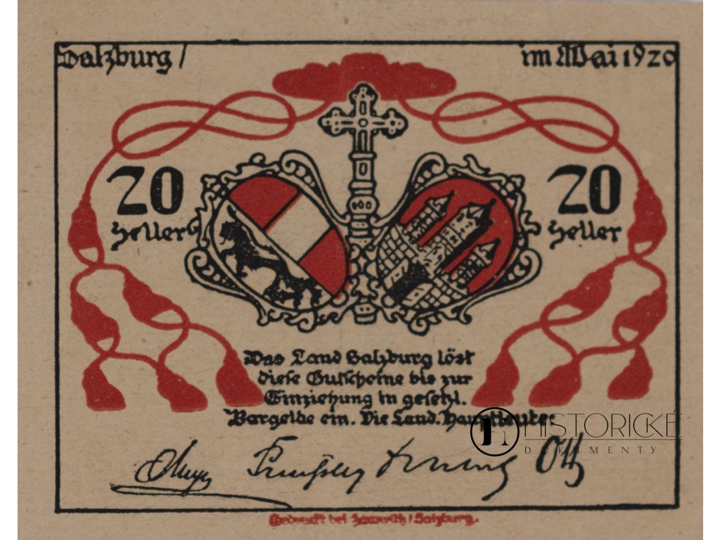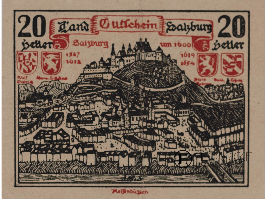 Na reversu zobrazen historický pohled na Salzburg s hradem Hohensalzburg a městskými erby z let 1287, 1612, 1619 a 1654. Revers obsahuje salzburské biskupské erby s křížem a textem o umoření gutscheinů do úplného vyrovnání. Bankovka jest opatřena podpisy úředníků a vytištěna Hauerovou tiskárnou v Salzburgu. Jedná se o vzácný notgeld s bohatou heraldickou a historickou symbolikou. Výtečná památka pro sběratele rakouských nouzových bankovek.