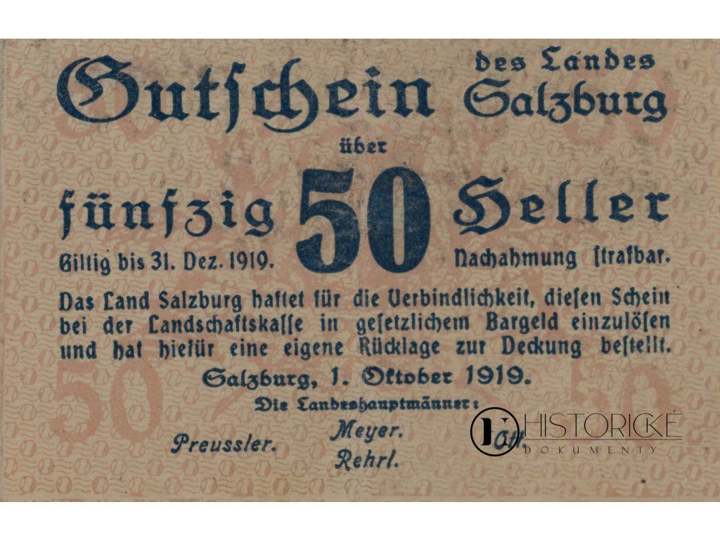 Splatná jest při Zemské pokladně v zákonném hotovém peníze, přičemž země Salcburk ručila za tuto závaznost celým svým jměním a zřídila vlastní krycí rezervu. Poukázka jest podepsána zemskými hejtmany Preusslerem, Meyerem, Rehrl a Ottem. Tisk jest proveden v barvách modré a růžové s opakujícím se vzorem podtisku. Jde o vyšší hodnotu téže salcburské emise podzimu 1919. Stav velmi pěkný, barvy živé, zachovalý.