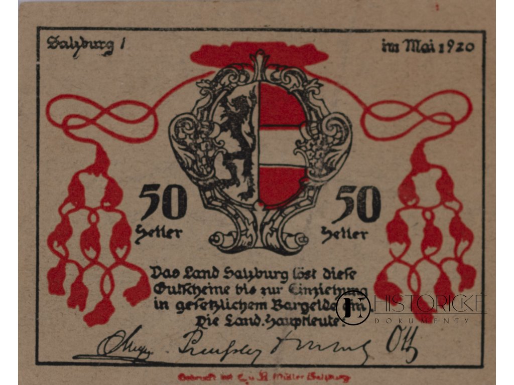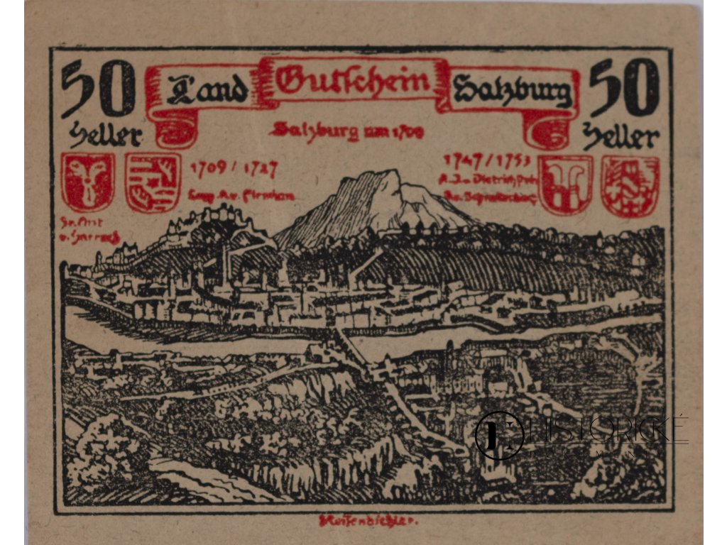 Revers zobrazuje historický pohled na Salzburg roku 1700 s městskými erby z let 1709/1727 a 1747/1753. Avers obsahuje salzburský biskupský erb s křížem a červeno-bílým štítem plus ornamentální výzdobu s textem o umoření gutscheinů do úplného vyrovnání. Bankovka jest opatřena podpisy úředníků a vytištěna Hauerovou tiskárnou v Salzburgu. Jedná se o vzácný notgeld s bohatou heraldickou symbolikou a historickými motivy. Výtečná památka pro sběratele rakouských nouzových bankovek.