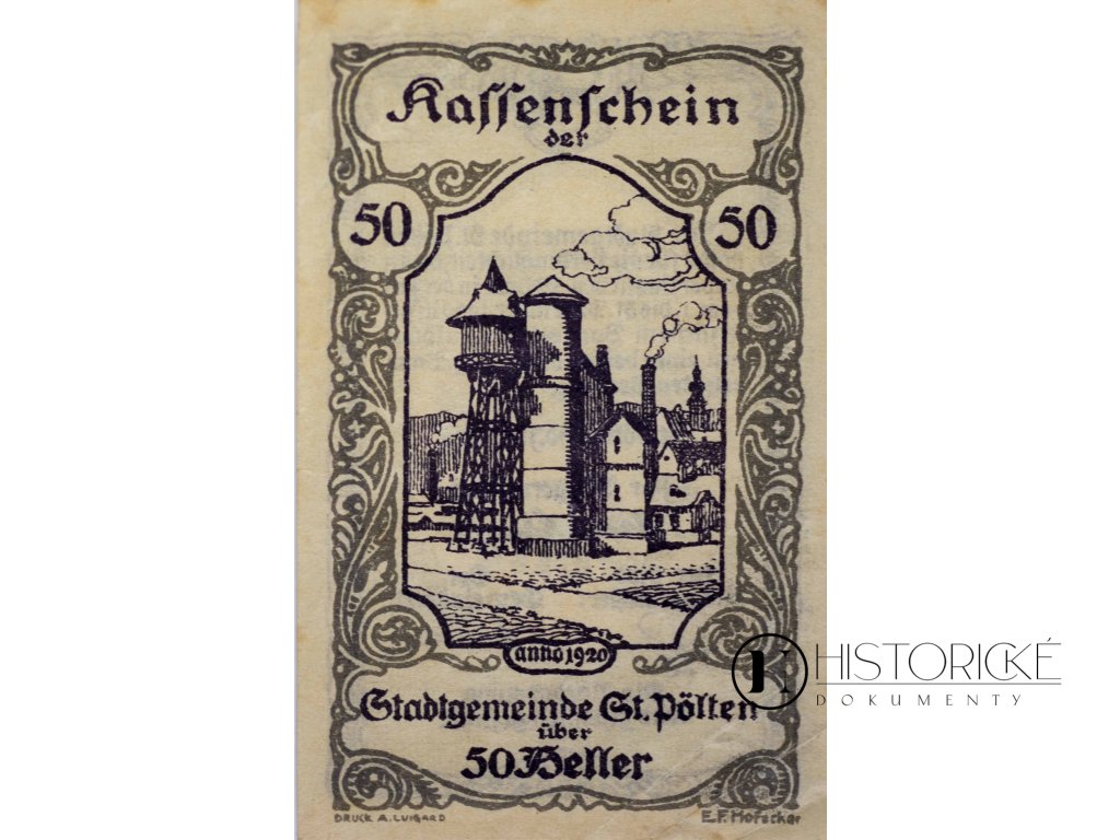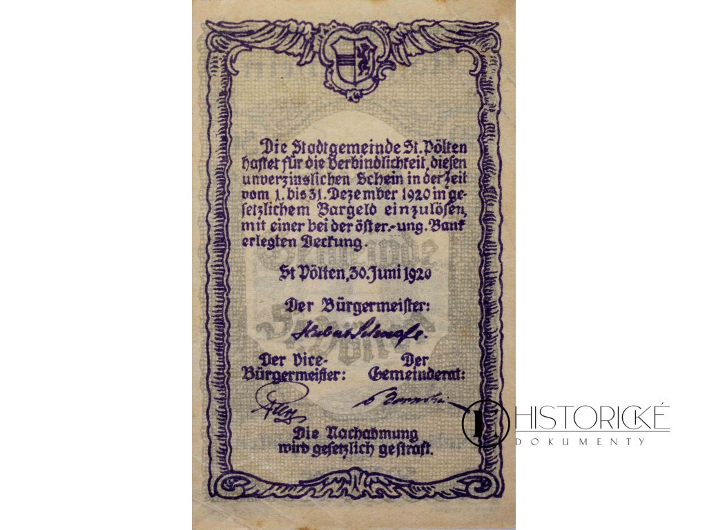 Na líci zobrazen jest malebný výjev městské věže a průmyslových budov, mistrem E. F. Mörtickem navržený. Na rubu obsahuje podrobné poučení o platnosti od 1. do 31. prosince 1920 a podpisy purkmistra, náměstka purkmistra a obecního rady. Tištěna byla v tiskárně A. Luigarda. Nouzové platidlo toto vzácným jest svědectvím poválečných poměrů hospodářských.
