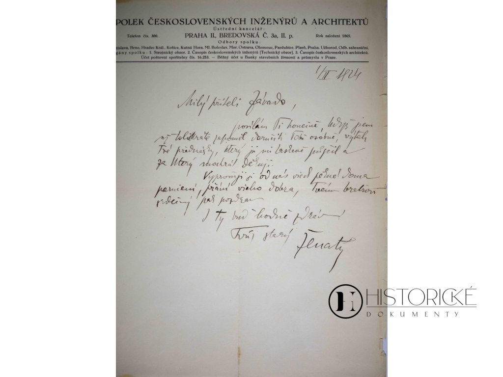 Dokument obchodní, korespondence ze Spolku československých inženýrů a architektů v Praze pocházející. Datována jest k prvnímu dni měsíce února léta Páně 1924, tedy v době prvé republiky Československé. Psána jest rukou pomocí pera, což krasopisnost a vážnost komunikace dokládá. Dokument tento vzácným jest svědectvím o činnosti učených společností technických za první republiky a cenným dokladem organizace vzdělanců stavitelských a inženýrských, jež o zvelebení vlasti naší pečovali.ch.