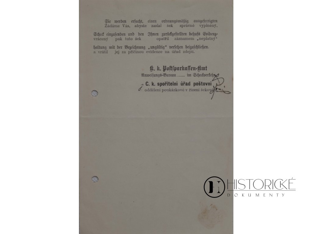 Písemnost týká se šeku číslo 50/4 v hodnotě 2.500 korun, adresovaného filiálce Anglobanky v Praze. Úřad sděluje, že šek nemůže býti vyřízen, jelikož účet číslo 99.390 byl již zrušen. Dokument dvojjazyčný, v řeči německé i české, opatřen podpisem úředním. Formulář D.S. Nr. 288 A z roku 1917. Vzácné svědectví bankovního styku v dobách monarchie rakousko-uherské, stav zachovalosti znamenitý.