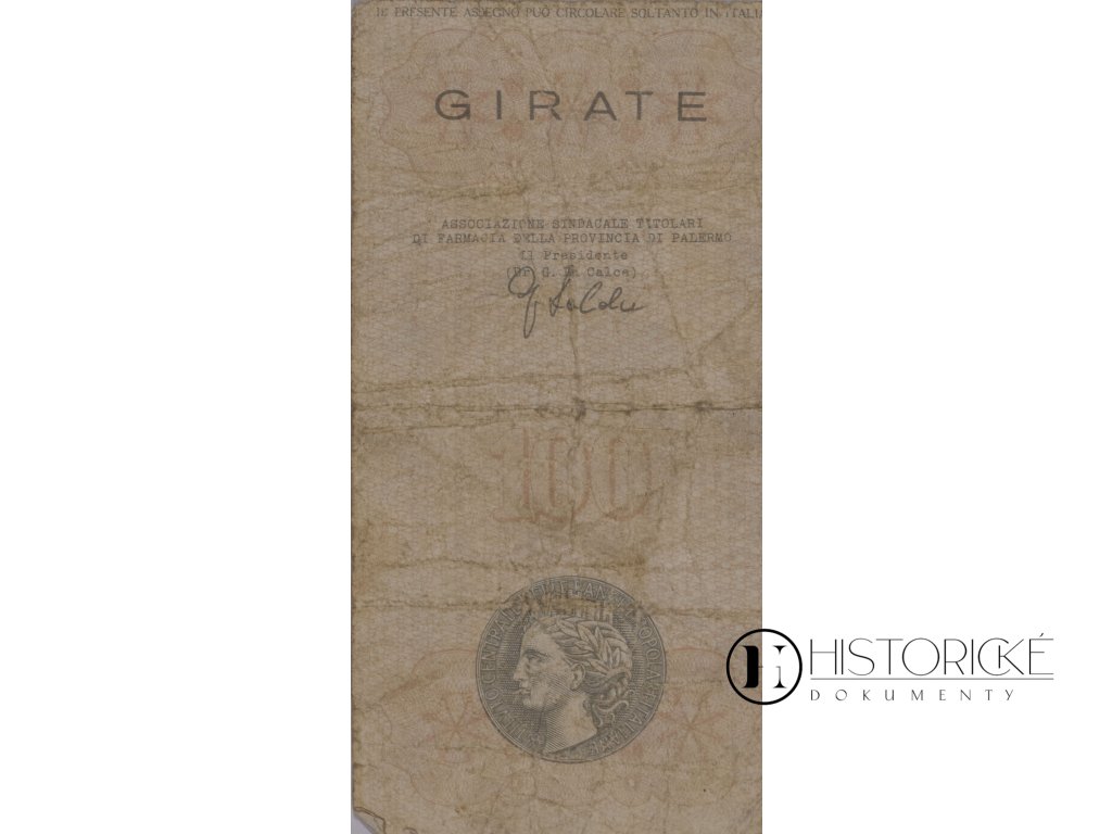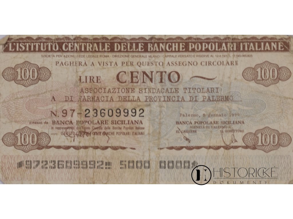 Hodnota sto lir italských, číslo 97-23609992, vystavený pro Odborové sdružení majitelů lékáren provincie Palermo. Emitován Lidovou bankou sicilskou, Banca Popolare Siciliana. Šeky tyto, zvané miniassegni, vznikly v Itálii sedmdesátých let pro nedostatek mincí drobných a sloužily jakožto platidlo náhradní. Sicílie, ostrov při špičce boty italské, obchodem a řemesly kvetla. Stav oběhem poznamenaný. Kuriozita numismatická pro sběratele platidel italských.