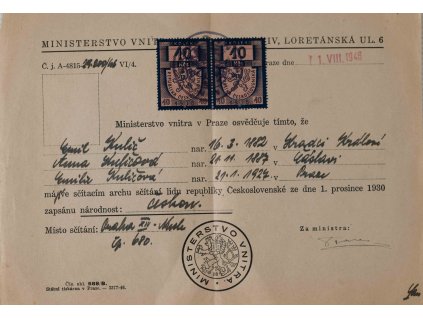 Osvědčení Ministerstva vnitra o zapsané národnosti, 1. VIII. 1946, vydané na základě záznamu ve sčítacím archu republiky Československé ze dne 1. Porsince, 1930. Kolek 2 x 10...