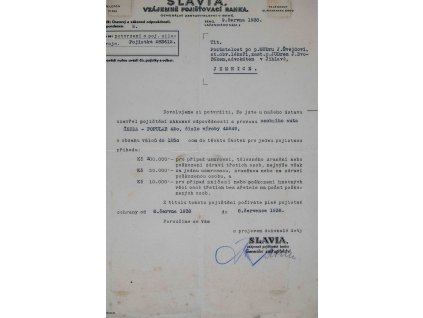 Obchodní Korespondence, Pojišťovna Slavia, potvrzení o uzavření pojištění zákonné odpovědnosti z prpvoziu osobního auta Škoda - Popular 420. 8. ČVervna, 1938.