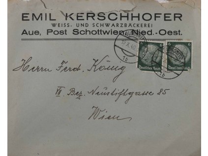 Obálka obchodní, Emil Kerschhofer, Weiss und Scwarrzbackerrei. 19. X. 1940. Známka 2 x.