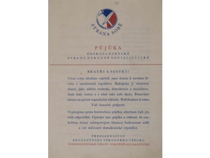 Propagační leták, Československá strana národně socialistická, Půjčka - strana sobě. 2 listy textu pro Bratry a sestry