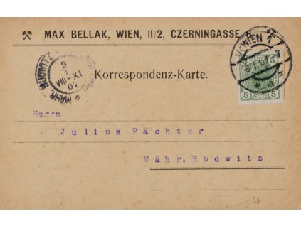 Celina - dopisnice (korrespondenzkarte), Max Bellak - Wien, 8. I. 1907. Adresováno: Julius pACHTER. Známka, razítko, prošlá.
