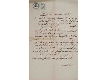Vzácný dokument z léta Páně 1863, psaný švabachem německým rukopisem úhledným. V záhlaví dva kolky poštovní rakouské po 10 a 50 krejcarech s orlem dvouhlavým, razítkem...