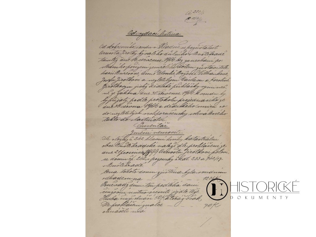 Odevzdací listina c. k. okresního soudu v Kladně ze dne 13. září roku 1906, číslo jednací 7356. Dokument o šesti svázaných stranách, kaligraficky provedený perem v duchu nejlepších tradic písařského umění úředního. Listina obsahuje přehled inventáře a jmění nemovitého převáděného dědicům po ukončení řízení pozůstalostního. Odevzdací listiny vydávaly se soudem poté, co dědictví bylo projednáno a dědici svá práva prokázali. Opatřena úředními razítky c. k. soudu kladenského a vlastnoručními podpisy soudce i zapisovatele. Kladno v oné době rostlo v průmyslovou metropoli, jejíž obyvatelé nabývali majetků značných. Krasopisné provedení svědčí o péči, již úřady věnovaly dokumentům právní váhy. Vazba původní, listy kompletní, inkoust sytý.