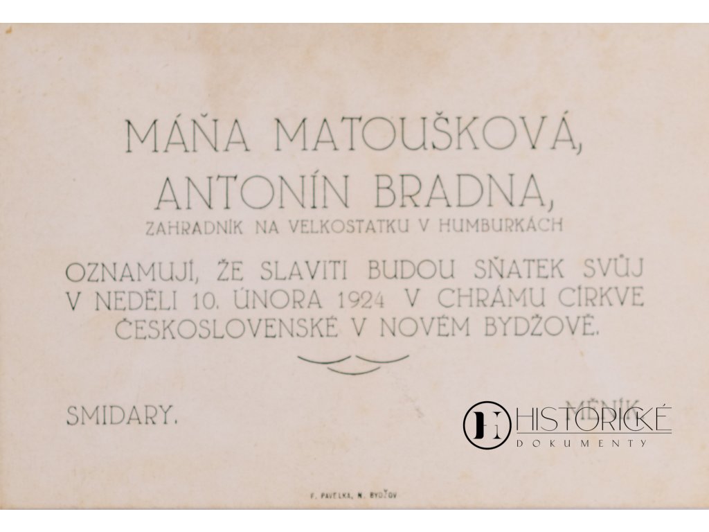 Svatební oznámení Máňi Matouskové a Antonína Bradny, zahradníka na velkostatku v Humburkách, z roku 1924. Oznámení informuje o slavnosti sňatku, jenž se má konati v neděli 10. února 1924 v chrámu Církve československé v Novém Bydžově. Dokument jest vytištěn v typografii F. Pučlík v Bydžově a představuje vzácnou památku z období první Československé republiky. Jedná se o autentický historický pramen každodenního života a církevních obyčejů dvacátých let. Neocenitelný materiál pro badatele genealogie a sociálních dějin meziválečného Československa.