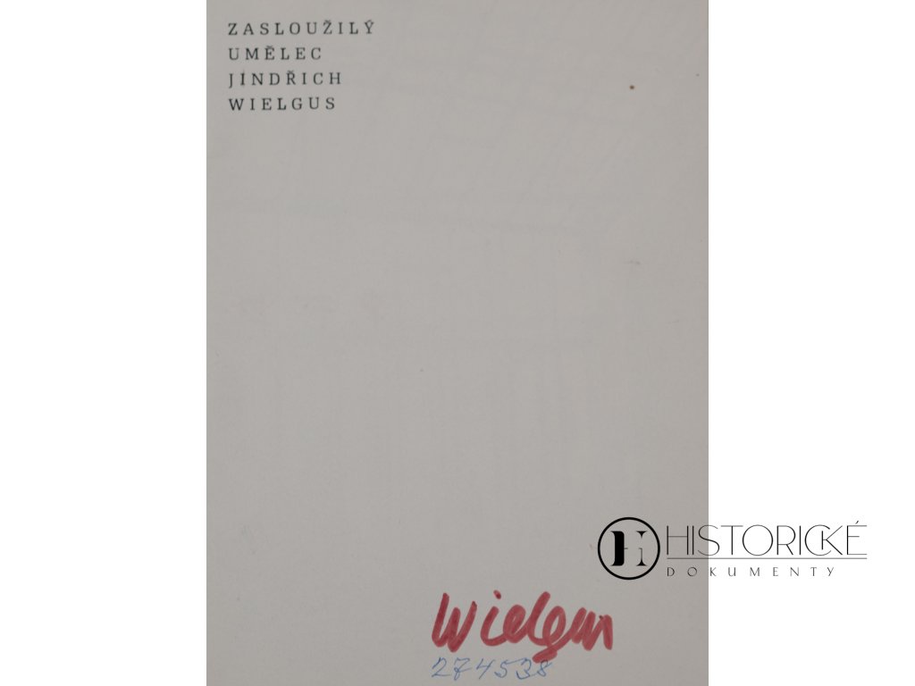 Novoroční přání PF 1988 od výtvarníka Jindřicha Wielguse s nápisem francouzským "Pour féliciter" (K blahopřání). Tisk na papíře kvalitním, přání složené do formátu dopisního. Opatřeno vlastnoručním podpisem umělcovým a fotografií jeho ateliéru tvůrčího. Wielgus, grafik a typograf český, proslul mistrovstvím v umění knižním a plakátovém. PF dokládá tradici novoročních přání uměleckých, kdy výtvarníci čeští svým přátelům a známým posílali dílka originální. Vzácná památka z posledních let socialismu, cenná pro milovníky grafiky české i sběratele novoročenek.