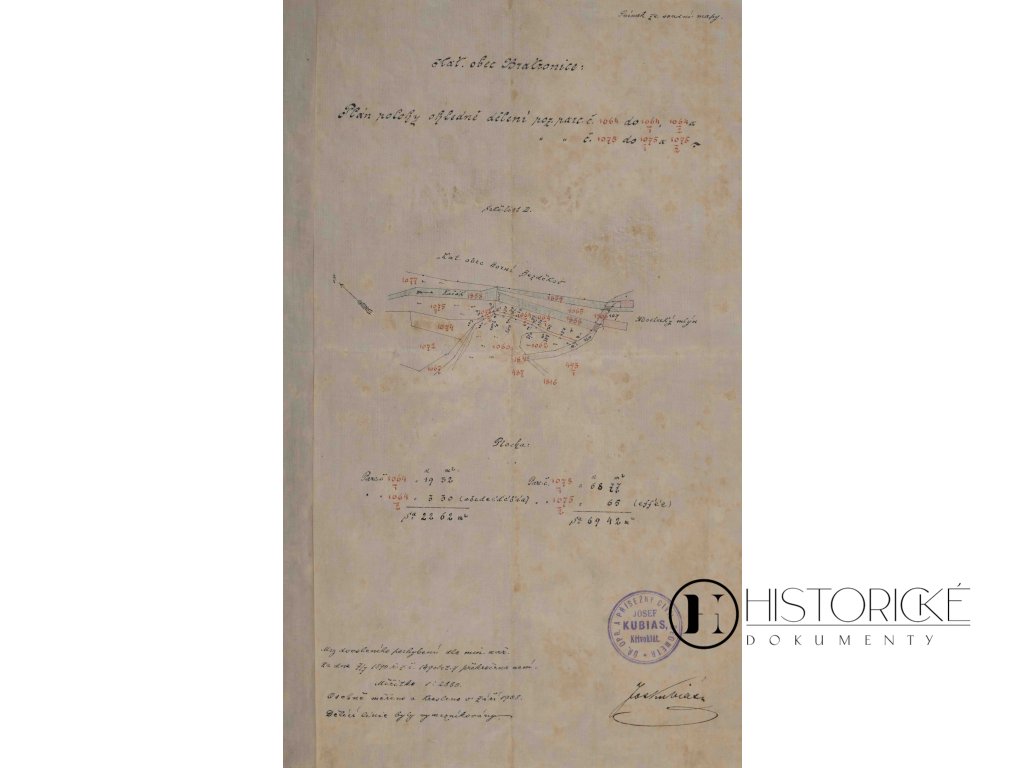 Plán rozlohy ohledně rozdělení parcel číslo 104 a 1075 v obci Bratronice, zhotovený léta Páně 1908 v měřítku 1:2880, jak tehdáž při mapování katastrálním obvyklé bývalo. Dokument opatřen jest razítkem Josefa Kubii, geometra úředního v Křivoklátě, jenž vyměřování pozemků v kraji podbrdském obstarával. Geometři, měřiči zemští, náleželi k odborníkům váženým, neboť bez práce jejich nemohly se pozemky děliti, prodávati ani děditi. Plán tento podává svědectví o parcelaci půdy v časech, kdy venkov český procházel změnami hospodářskými. Křivoklát, město pod hradem loveckým králů českých, mělo geometry zkušené. Vzácná památka zeměměřičská pro sběratele map a dokumentů katastrálních