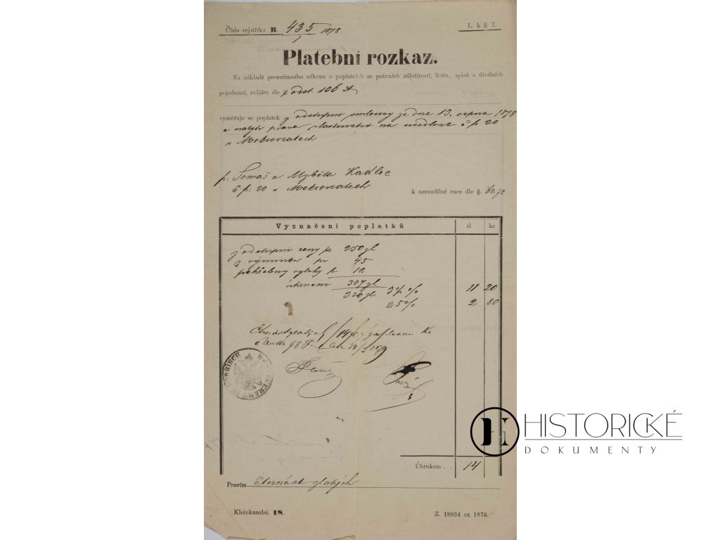 Platební rozkaz z obce Mokrovraty, vydaný dne 13. srpna léta Páně 1878, za panování Jeho Veličenstva císaře a krále Františka Josefa I. Dokument pochází z c.k. berního úřadu v Dobříši, města panského v kraji podbrdském. Listina psána jest rukou úřednickou, opatřena razítkem úředním. Platební rozkazy vyzývaly poddané k zaplacení daní a poplatků berních, jež do pokladny státní odváděny býti musely. Mokrovraty, ves při silnici dobříšské, pod správou berní dobříšskou náležely. Berní úřady c.k. monarchie pečlivě dbaly na výběr kontribucí od lidu poddaného. Vzácná památka na finanční správu rakouskou a bernictví za doby císařské.