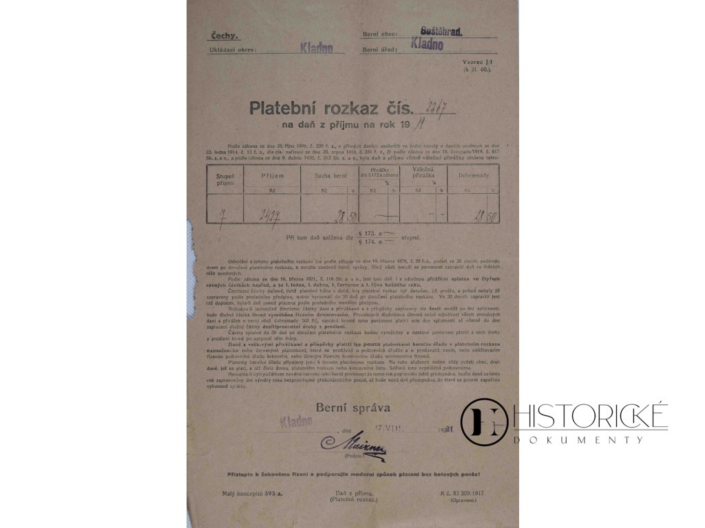 Platební rozkaz číslo 12367/19, vydaný berním úřadem v Kladně pro berní obec Buštěhrad, sepsaný dne 17. srpna léta 1921. Dokument obsahuje podrobné vyčíslení daně, již poplatník povinen jest odvésti do pokladny státní. Listina opatřena jest razítky úředními i podpisem berního úředníka, text psán perem. Buštěhrad, město starobylé pod hradem královen českých, náležel do obvodu berní správy kladenské. První léta republiky Československé přinesla nové pořádky daňové, leč úřady berní pokračovaly v práci své pilně. Vzácný doklad správy finanční mladého státu československého pro sběratele úředních listin