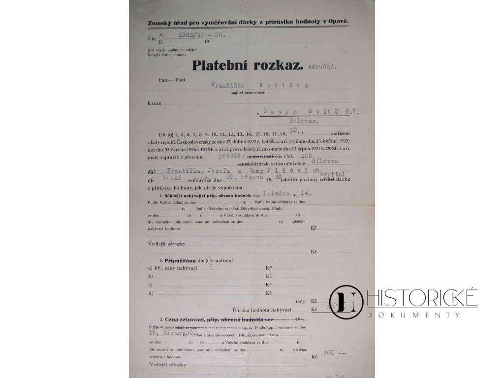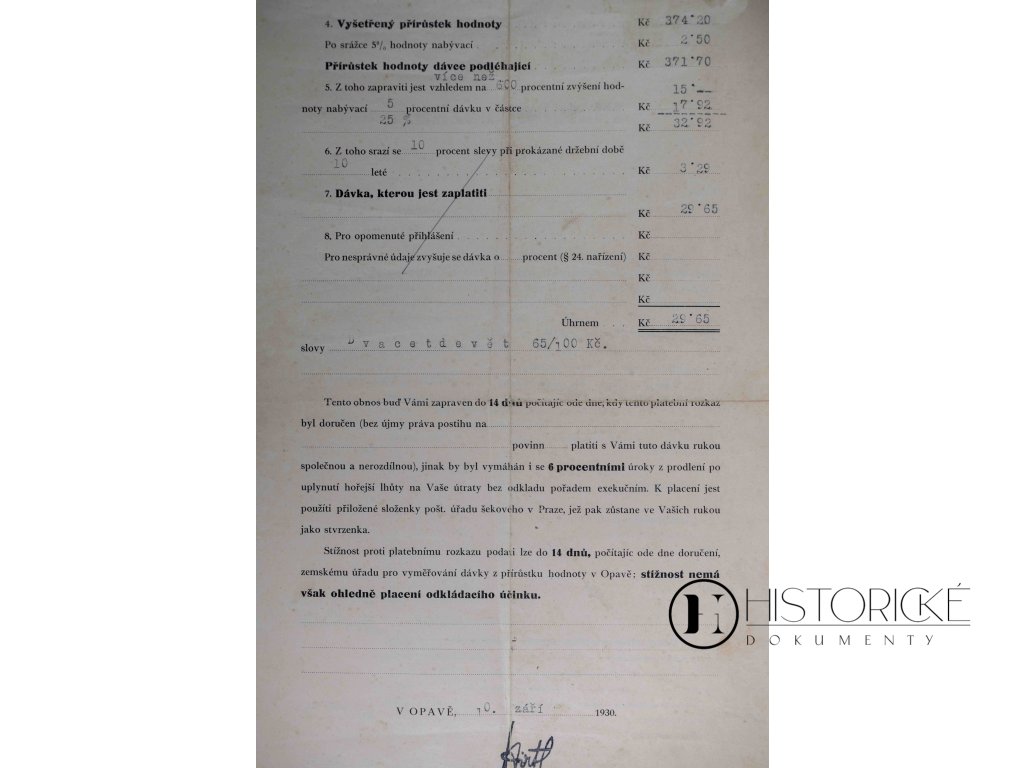 Platební rozkaz záruční vydaný Zemským úřadem pro vyměřovací dávky z přírůstku hodnoty v Opavě dne 10. září léta Páně 1930. Dokument obsahuje úřední vyčíslení dávky, opatřen jest razítkem úřadu a vlastnoručním podpisem úředníka. Jest to zajímavý doklad daňové soustavy meziválečného Československa, kdy zemské úřady spravovaly speciální dávky z přírůstku hodnoty nemovitostí. Pro sběratele úředních dokumentů i badatele v dějinách československé daňové správy a správního práva předmět nadmíru vzácný, jenž ilustruje fungování státní administrativy v období první republiky a systém vybírání speciálních dávek na Opavsku v době hospodářské prosperity před krizí třicátých let.