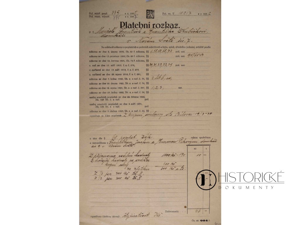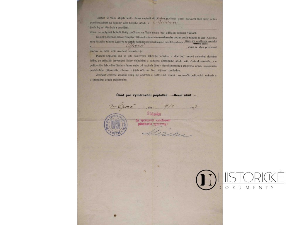 Platební rozkaz vydaný Úřadem pro vyměřování poplatků v Opavě dne 9. února 1930, obsahující podrobné vyčíslení dlužných částek a opatřený úředním razítkem s podpisem. Dokument pochází z období hospodářské krize ve Slezsku a představuje autentický svědek fungování československé finanční správy ve třicátých letech. Platební rozkaz jest cenným dokladem daňového systému první republiky a administrativních postupů úřadů v pohraničních oblastech. Tento exemplář dokumentuje každodenní činnost státní správy a jest významným artefaktem finančních dějin meziválečného Československa, kdy se rozvíjel moderní systém veřejných financí.