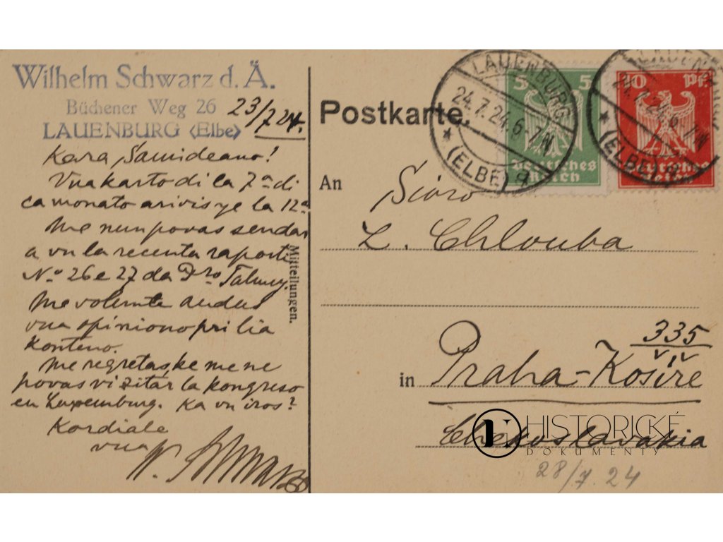 Pohlednice s portrétem baronky Berthy von Suttner, rakouské spisovatelky a pacifistky, nositelky Nobelovy ceny míru roku 1905. Autorka románu Die Waffen nieder! stala se symbolem mírového hnutí přelomu století. Na lícní straně rukopisný text v esperantu označuje ji jako eminentní pacifistku rakouskou. Rubová strana psána rovněž esperantem, odesláno Wilhelmem Schwarzem d. Ä. z Lauenburgu nad Labem dne 23. července 1924. Adresováno panu L. Chloubovi do Prahy-Košíř 335, Československo. Ofrankováno německými známkami 5 a 10 feniků s říšskou orlicí. Text zmiňuje kongres v Lucemburku a esperantský časopis. Pohlednice dokládá mezinárodní esperantské hnutí a úctu k pacifistickému odkazu baronky Suttnerové.