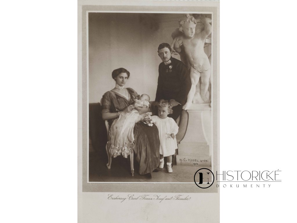 Vzácná pohlednice s portrétem arcivévody Karla Františka Josefa s rodinou z dob Rakouska-Uherska. Pohlednice jest nenadepsaná, neprošlá poštou a bez známky, což ji činí zvláště vzácnou jako nepoužitý exemplář. Arcivévoda Karel František Josef (1802-1876) byl bratrem císaře Františka Josefa I. a významnou osobností habsburského rodu. Rodinné portréty členů císařské rodiny byly oblíbeným motivem pohlednic, jež sloužily k uctívání monarchie a šíření kultu osobnosti panovnického rodu. Pro sběratele habsburských memorabilií a badatele o dějinách Rakouska-Uherska představuje vzácné svědectví o kultu osobnosti královské rodiny a způsobu propagace monarchistických hodnot. Autentická památka na zlatou éru dualistické monarchie a úctu k císařskému domu.